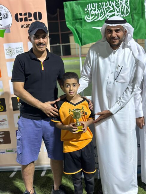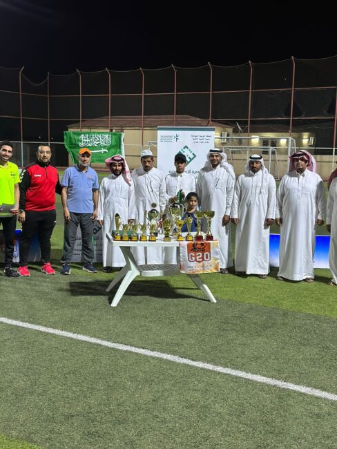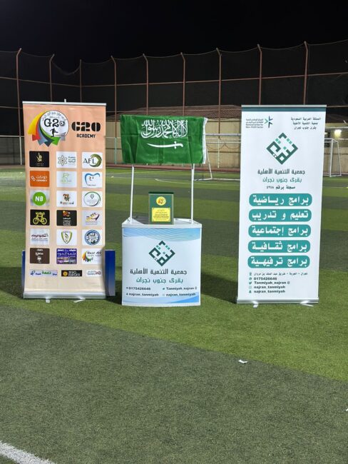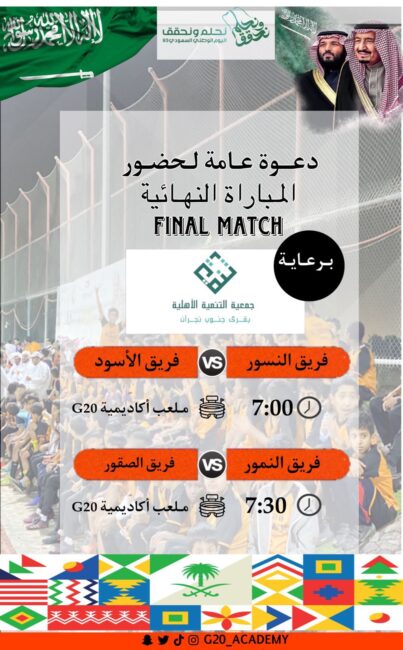 بالتعاون مع اكاديمية G20 جمعية التنمية الأهلية بقرى جنوب نجران ترعى المباراة الختامية بين فريقي الصقور والنسور على ملعب الأكاديميه والحفل الخاص باليومي الوطني 93 للملكة العربية السعودية .
