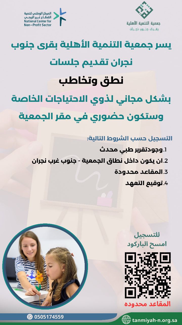 يسر جمعية التنمية الأهلية بقرى جنوب نجران تقديم جلسات ( نطق وتخاطب )
