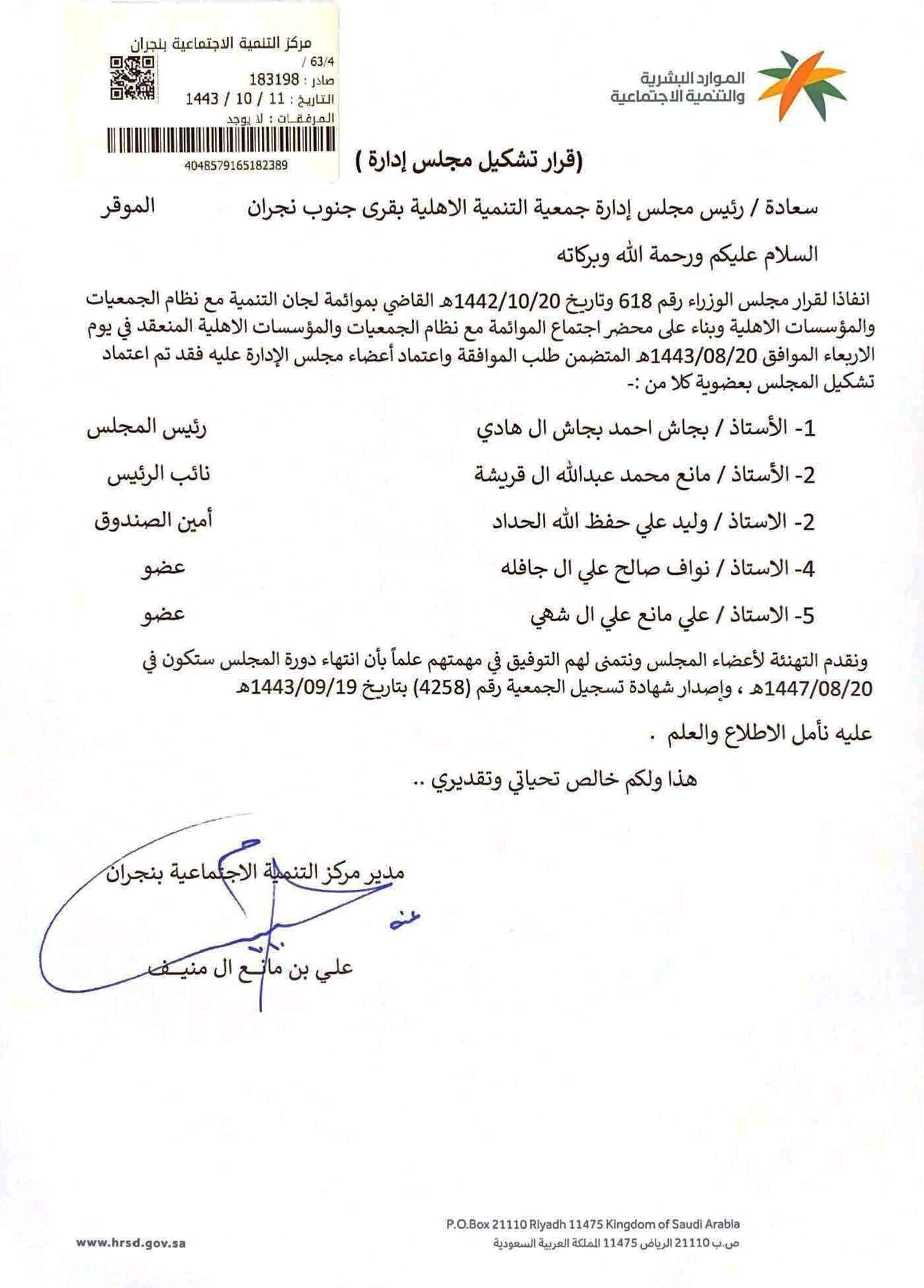 قرار تشكيل مجلس الإدارة قرار تشكيل مجلس الإدارة » جمعية التنمية الاهلية بجنوب نجران شاركها مع أصدقائك